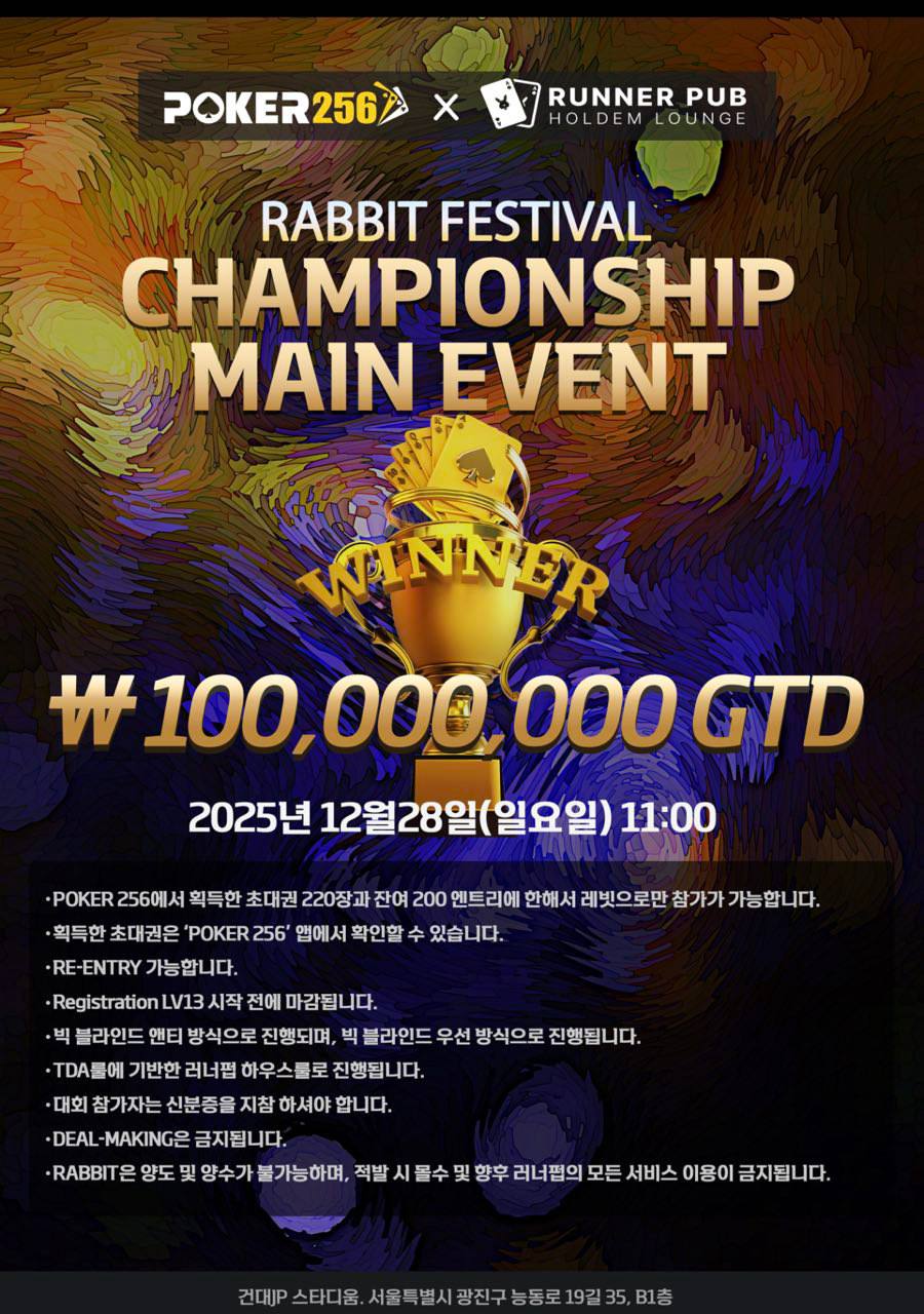 얼마전에 프리롤 했던 포커 256에서 이번에는 러너펍이랑 1억 홀덤 대회 하네요.