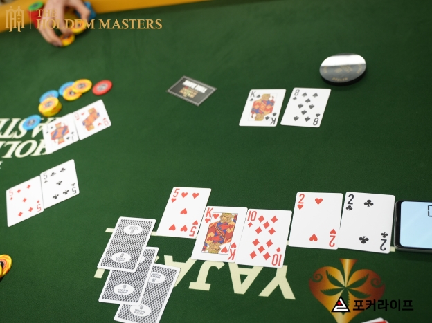 약 120,000칩을 보유한 MP 플레이어가 5,000으로 레이즈하자, HJ 플레이어가 남은 13,500칩을 all-in했다. 그러자, BTN 플레이어가 45,000 가량 남은 칩을 all-in했고, MP 플레이어가 잠시 고민하다 콜했다.