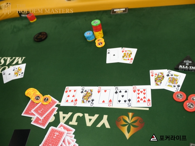 MP 플레이어가 남은 34,000칩을 all-in하자, HJ 플레이어가 121,000칩을 all-in했다. 이어서, SB 플레이어가 119,000칩을 all-in 콜하면서 3-Way 쇼다운이 진행됐다.