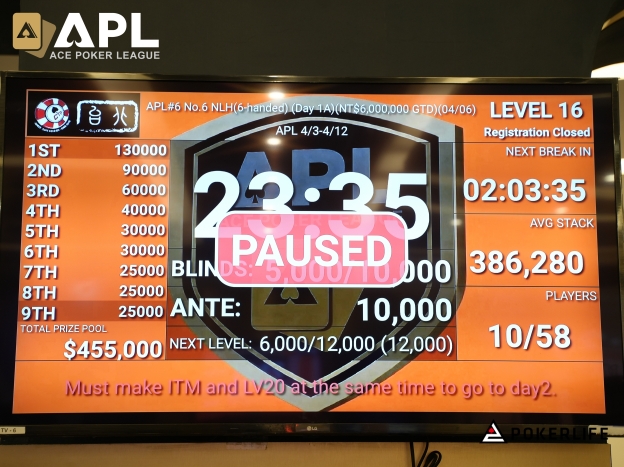 6-max로 진행되는 No.6 No Limit Holdem 이벤트의 Day1A는 58엔트리를 기록했으며, 엔트리의 15%인 9명의 플레이어가 입상을 확정짓게 된다. 10명의 플레이어가 생존하자, 입상을 결정지을 Hand For Hand가 진행됐다.
